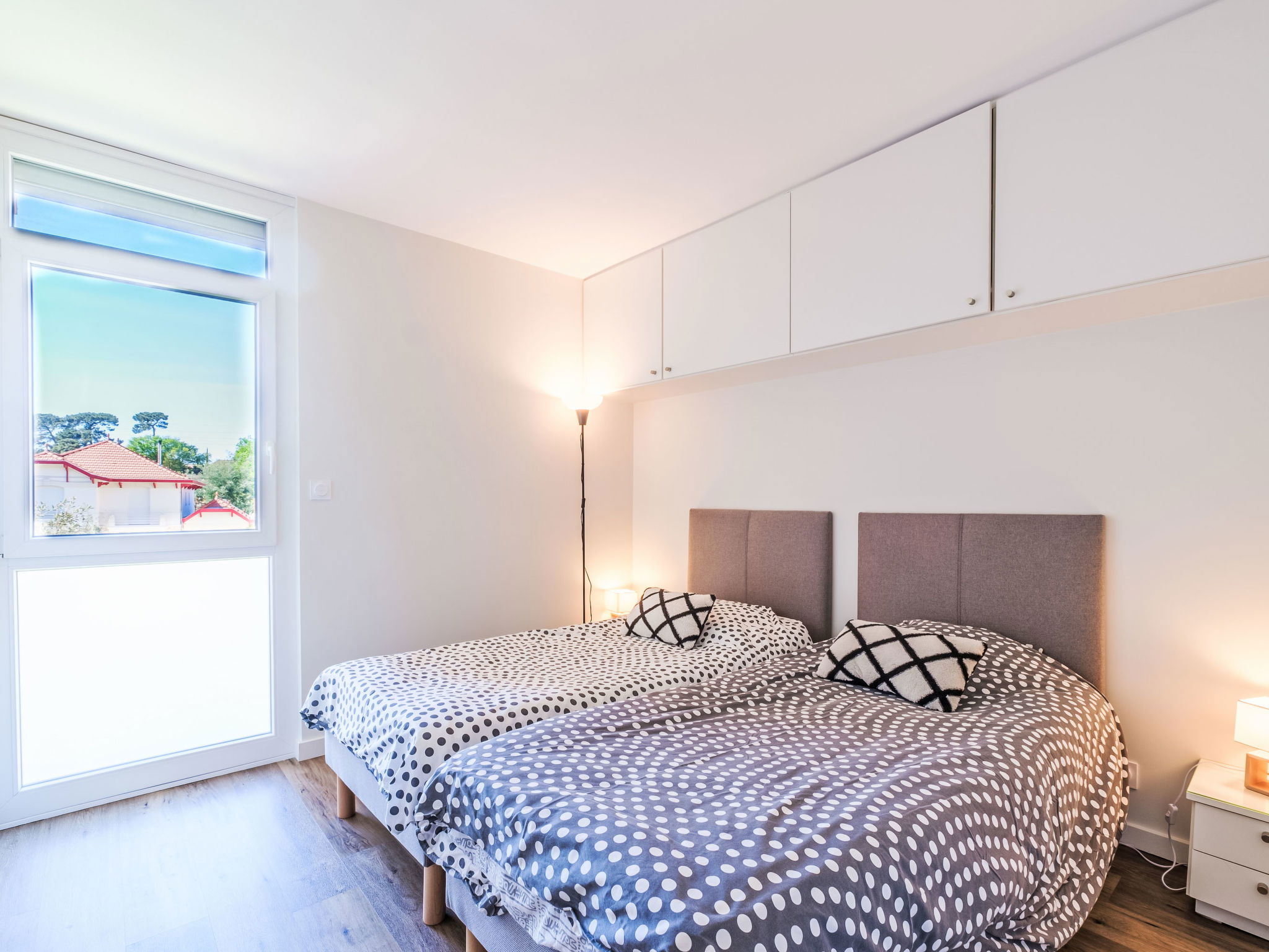 Arcachon: Résidence "Arcachon Marines". Dans le quartier de d'Aiguillon, à 1.2 km de la mer, à 1.2 km de la plage. Magasins 1 km, magasin d'alimentation, supermarché 850 m, centre commercial 2.6 km, restaurant 1 km, bar 1 km, boulangerie 1 km, café 1 km, arrêt de bus "Les Mouettes" 50 m, gare ferroviaire "Arcachon" 1.7 km, plage de sable "Aiguillon" 1.2 km, parc "Mauresque" 2 km, piscine couverte 50 m, centre thermal "Thalazur" 14.2 km. Port plaisance 2.3 km, terrain de golf (18 trous) 4.6 km. Attractions à proximité: Dune du Pyla 11.2 km, ArcaJetMarine 1.2 km, Observatoire Sainte Cécile 2.5 km, Marché Municipal 2.3 km, Eratopia 7.5 km, Navette Maritime pour le Cap Ferret 1.7 km. Les lacs connus sont facilement accessibles: Lac de la Magdeleine 8.8 km, Lac de Cazaux 16.3 km. La remise des clés a lieu à l’agence d'Arcachon, 2 km.