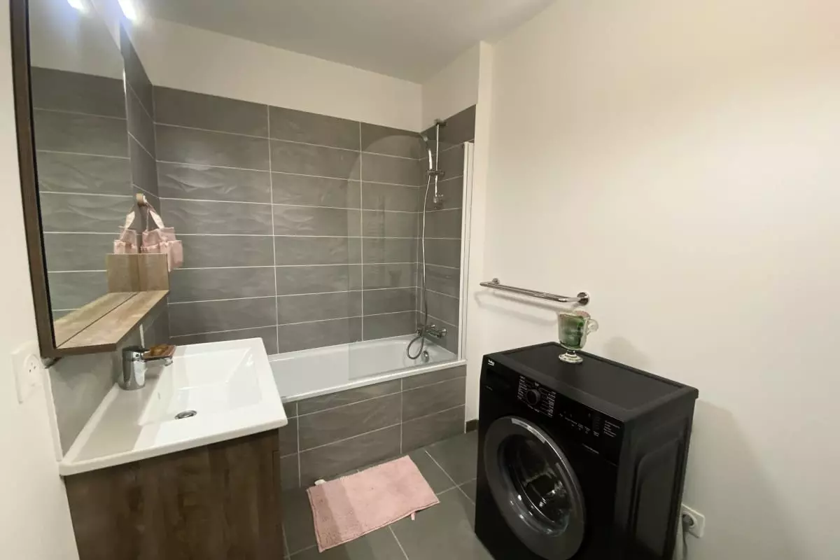 - La salle de bain est équipée d'une baignoire avec une paroi douche.