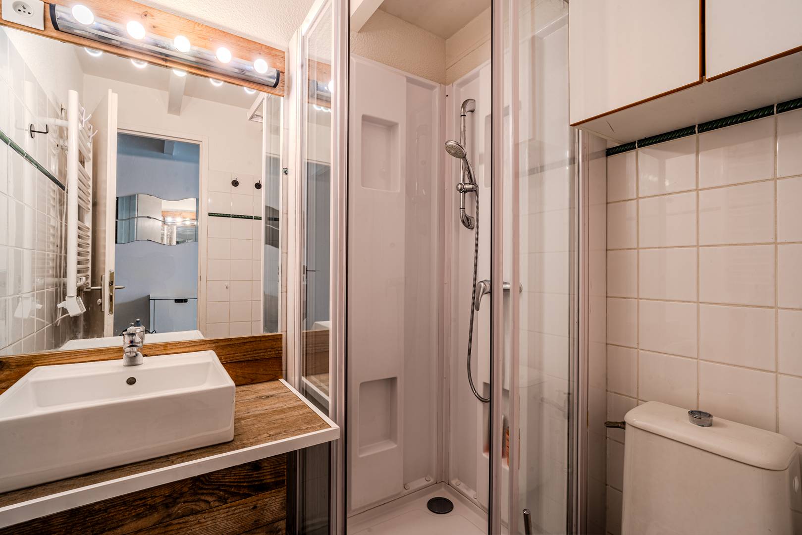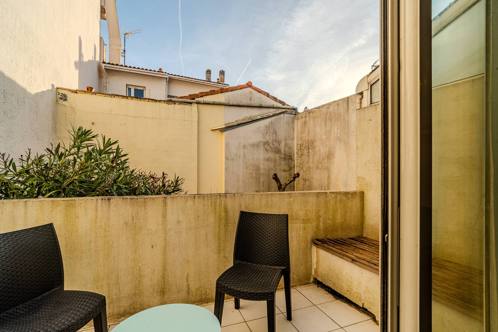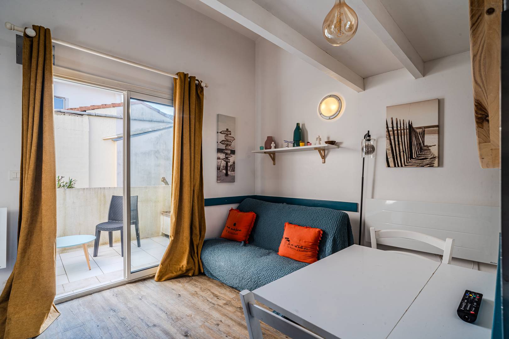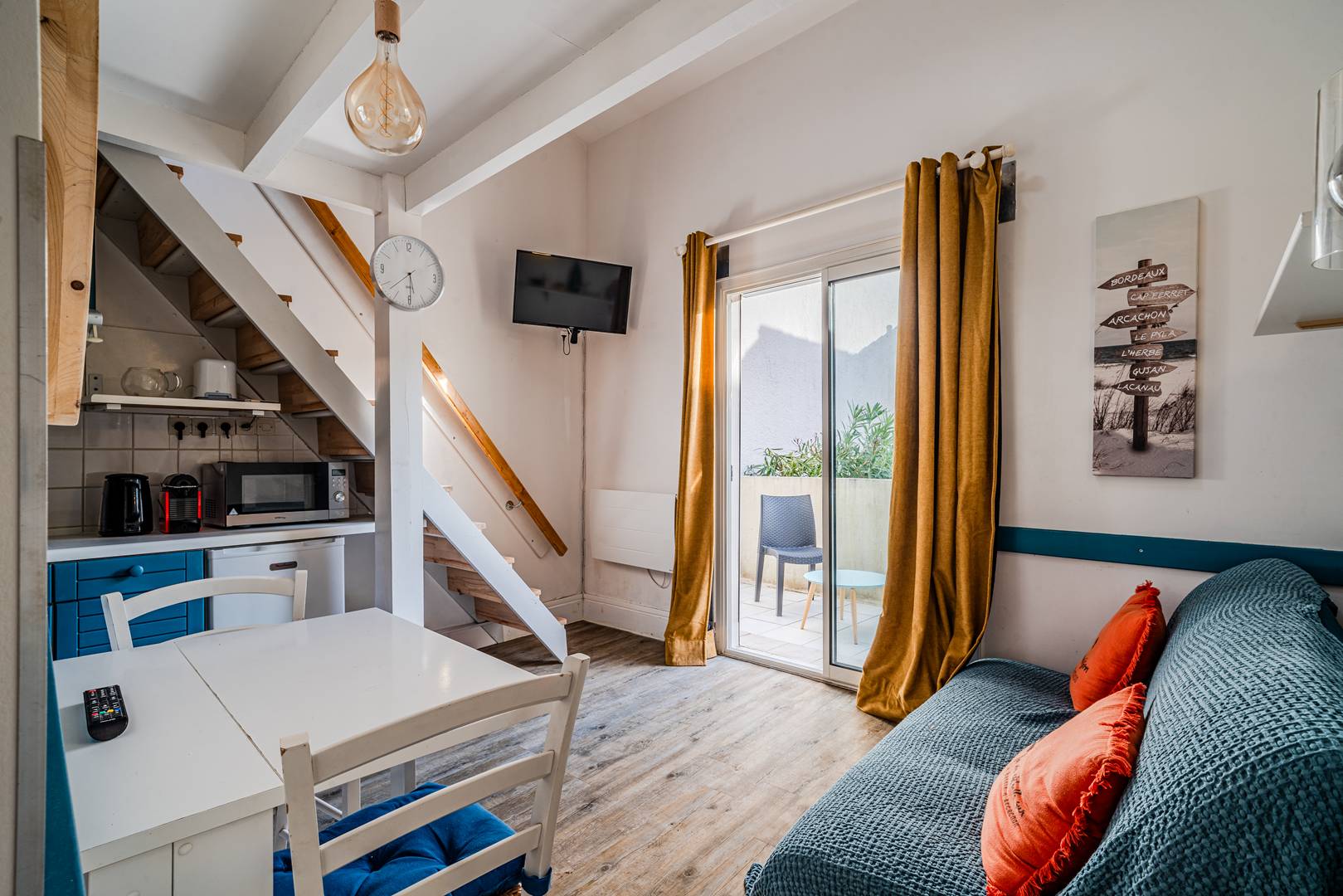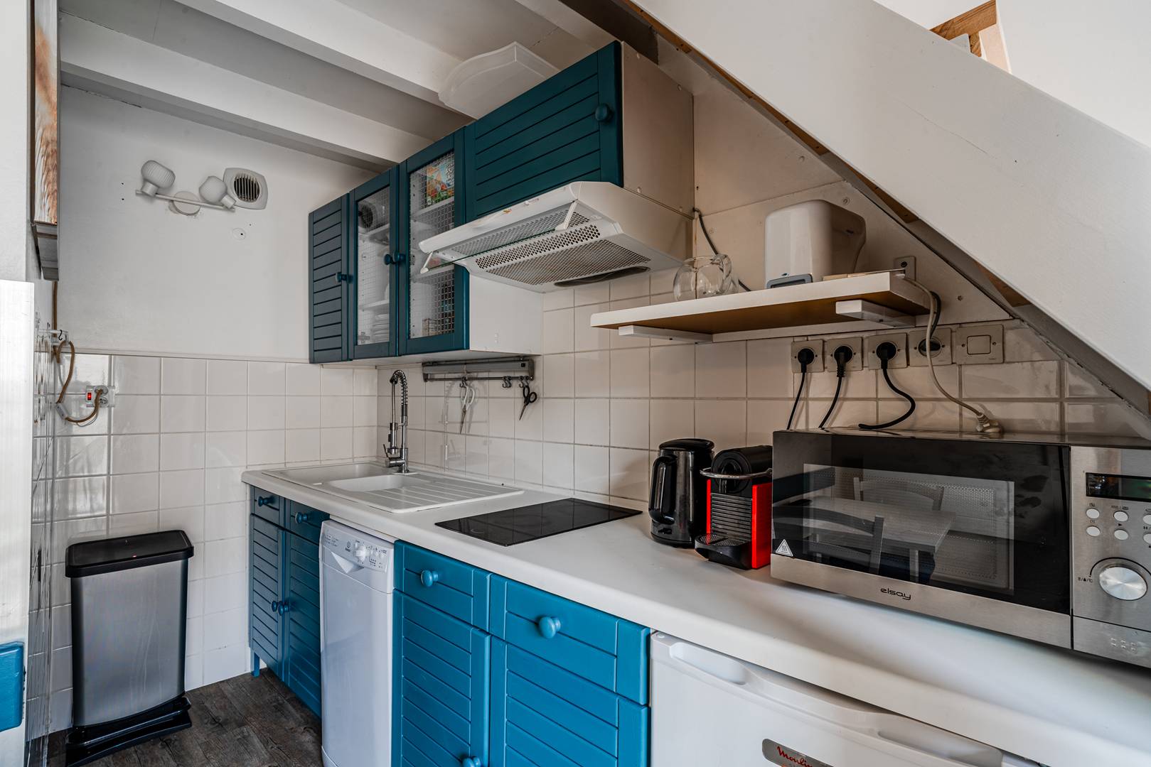 L’entrée s’ouvre sur un couloir desservant une chambre aveugle équipée d’un canapé-lit BZ en 140, une buanderie avec lave-linge séchant et rangements, ainsi qu’une salle d’eau avec WC. La pièce principale se compose d’un coin repas, d’un espace salon avec canapé et télévision et, dans un renfoncement, d’une cuisine entièrement équipée comprenant réfrigérateur, four micro-ondes, plaque induction deux feux, hotte, lave-vaisselle et machine Nespresso. L’ensemble donne accès à une terrasse exposée plein Sud, sans vis-à-vis, au calme, équipée d’un store banne et de mobilier permettant de prendre les repas à l’extérieur. À l’étage, en duplex, avec une hauteur sous plafond limitée, l’accès se fait par un escalier raide d’environ une douzaine de marches étroites. La pièce, éclairée par un Velux, est aménagée avec un lit en 160 et une télévision.