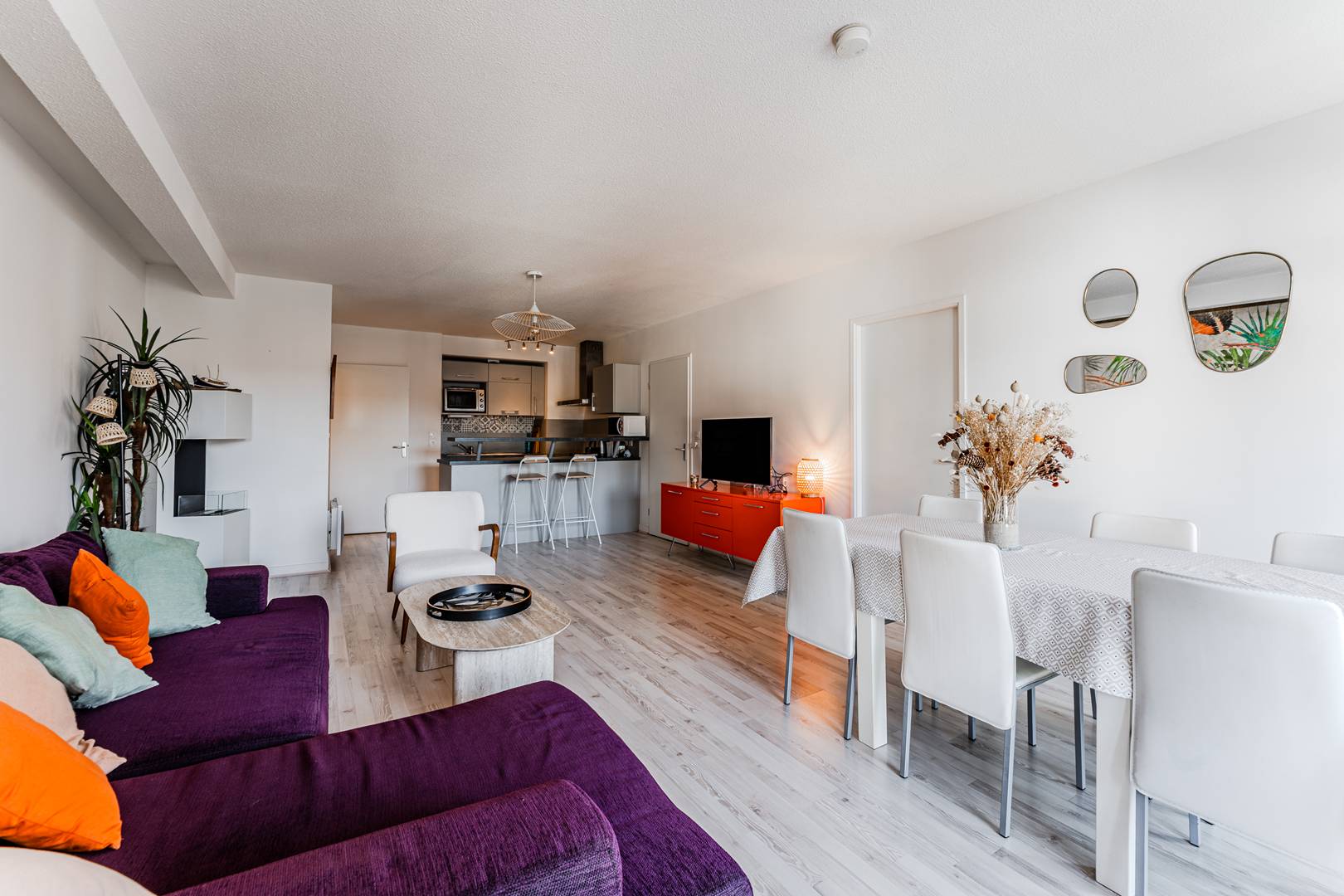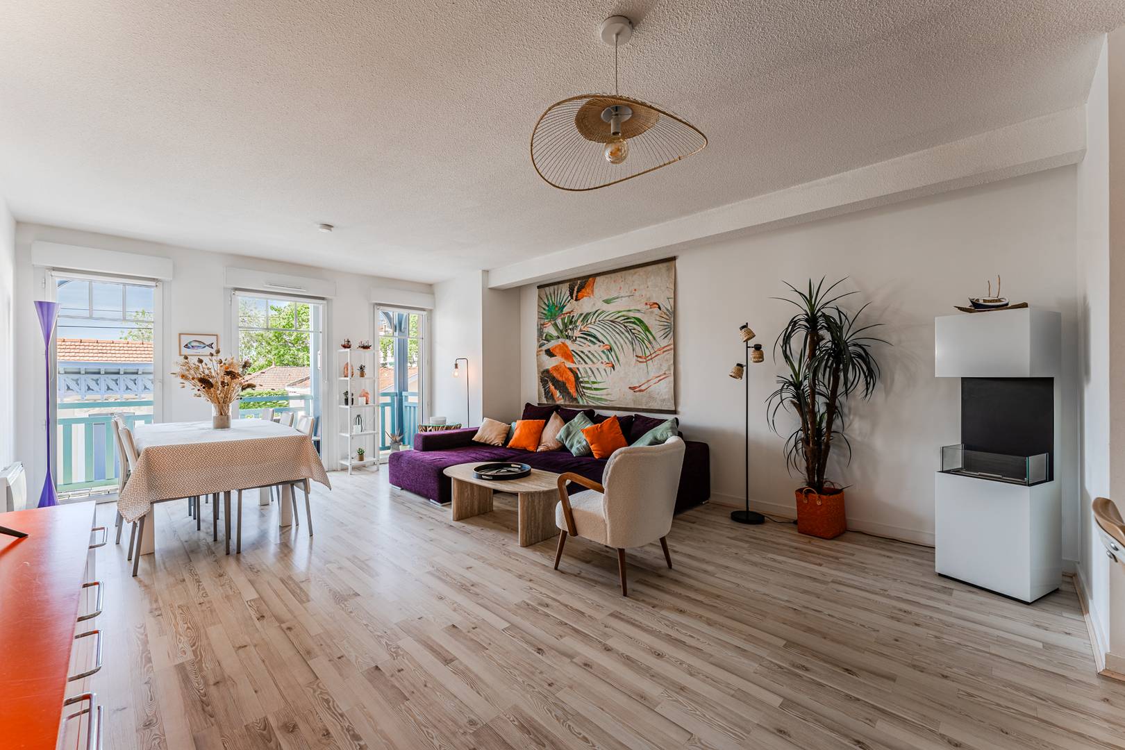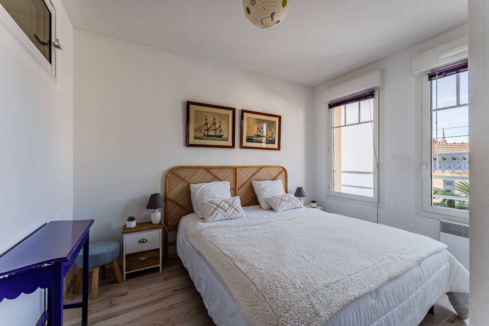 Dès l’entrée, un placard-penderie offre un espace de rangement pratique et distribue une première salle d’eau avec WC, ainsi qu’une chambre exposée Ouest, à la fois lumineuse et spacieuse, équipée d’un lit en 140 et de rangements intégrés. La pièce de vie, conviviale et bien agencée, se compose d’une cuisine ouverte particulièrement bien équipée avec lave-vaisselle, réfrigérateur, congélateur, mini-four, four micro-ondes, hotte et plaque électrique 4 feux. Un bar avec tabourets vient subtilement séparer cet espace du salon et de la salle à manger, où l’on retrouve un grand canapé confortable, une télévision et une table à manger. Un dégagement dessert une seconde salle d’eau avec WC et lave-linge, ainsi qu’une pièce aménagée en chambre ou cabine, disposant d’une fenêtre haute ouvrant sur la chambre 3, sans vis-à-vis, et équipée d’un lit escamotable en 140 faisant office de canapé une fois replié, d’une télévision et d’un placard-penderie. La troisième chambre, également exposée Ouest, dispose de deux lits en 80 rapprochés et de rangements. À l’extérieur, un balcon d’environ 5 m², exposé Ouest et donnant sur la rue, permet de profiter d’un espace agréable pour prendre un café ou se détendre en fin de journée. L’appartement est très bien équipé, notamment avec un accès Internet WIFI, facile d’entretien et décoré dans un style contemporain. Il bénéficie d’une situation particulièrement recherchée, avec le marché municipal accessible à pied en 8 minutes et la plage située à seulement 5 mn à pied. Les animaux ne sont pas admis. Le linge blanc n'est pas fourni mais peut être loué auprès de notre partenaire "Le Linge du Bassin" (code : vacances33). Une assurance annulation est incluse (adhésion facultative). Le ménage de départ est inclus, suite à un entretien normal et régulier de la location durant le séjour.