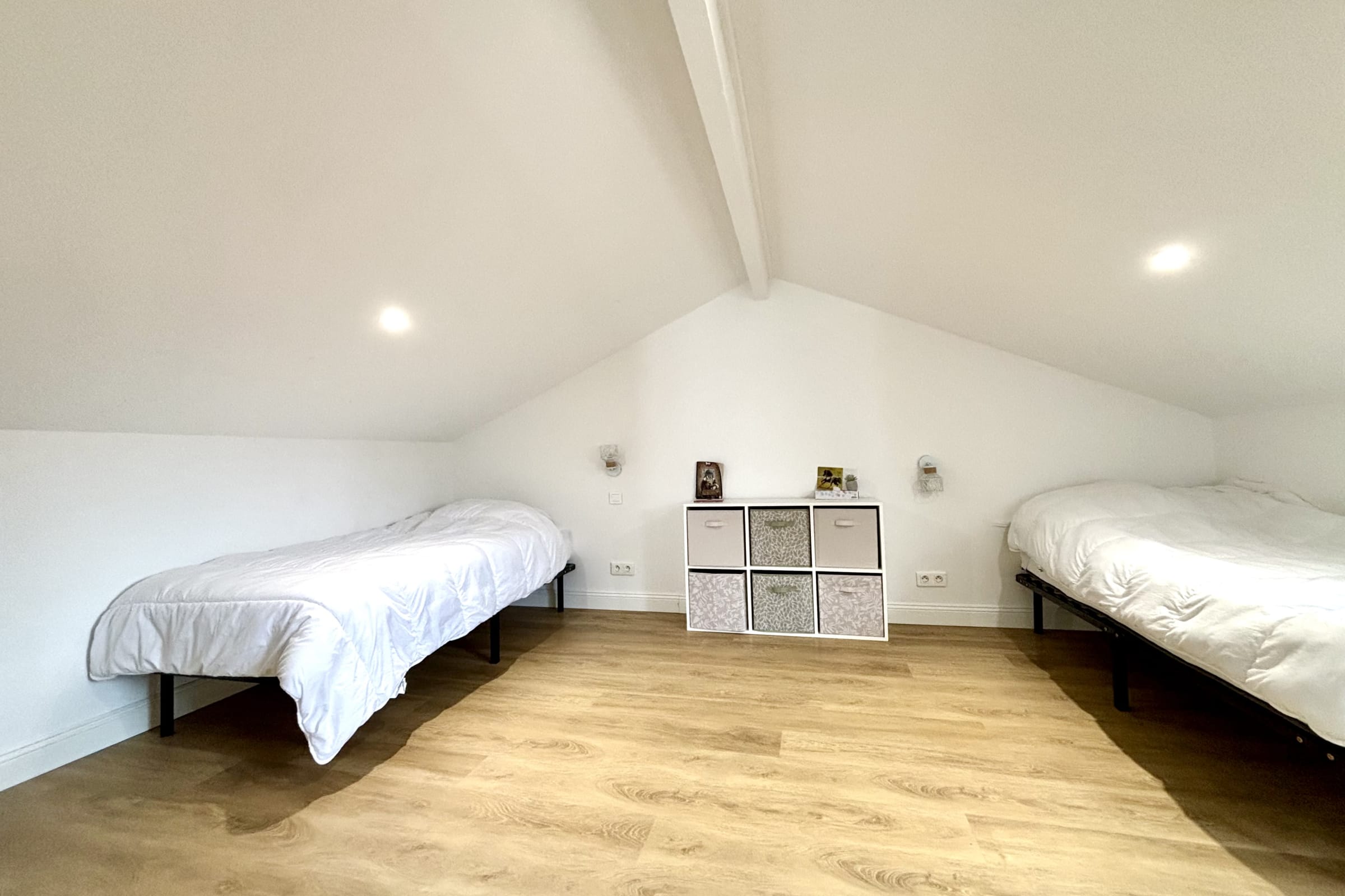 À l’étage, un dortoir accueille jusqu’à quatre personnes avec des lits simples, ainsi qu’une seconde salle d’eau. Idéal pour les enfants/ados.