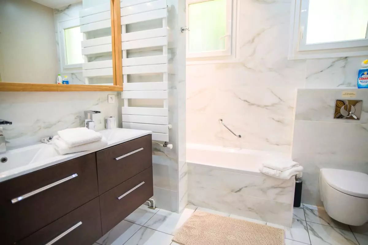 -Cuisine américaine moderne et entièrement équipée : machine Nespresso, lave-vaisselle, fours, plaques, réfrigérateur-congélateur, grille-pain, bouilloire.