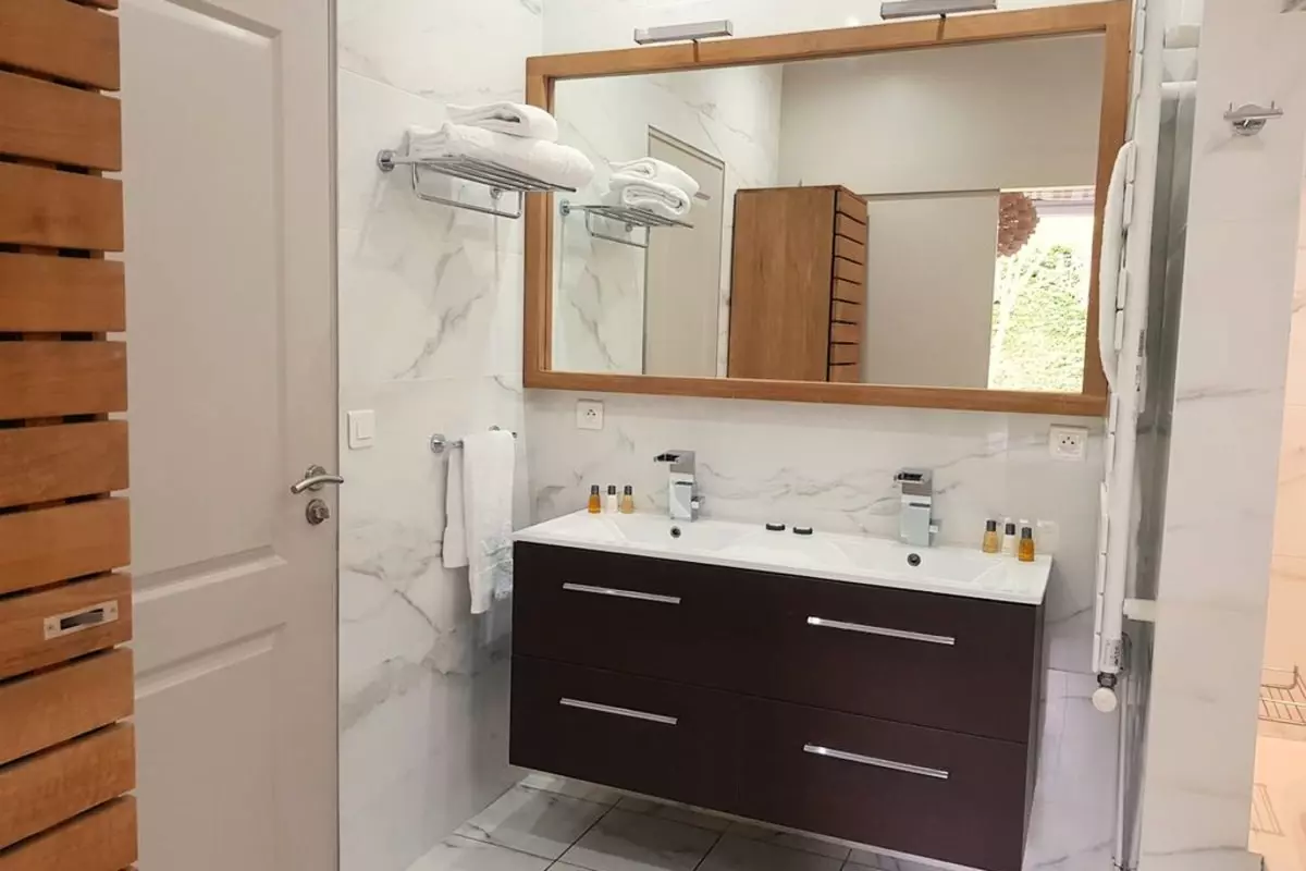 -Chambre 1 : lit queen-size, salle de bain privative (double vasque + WC).